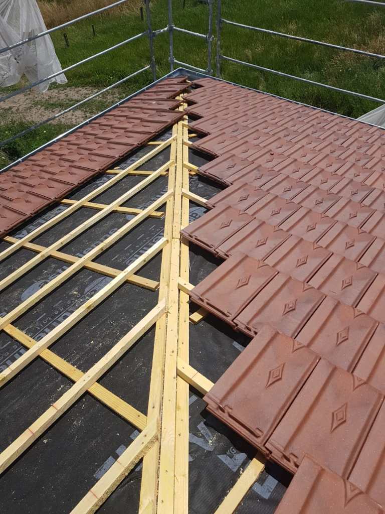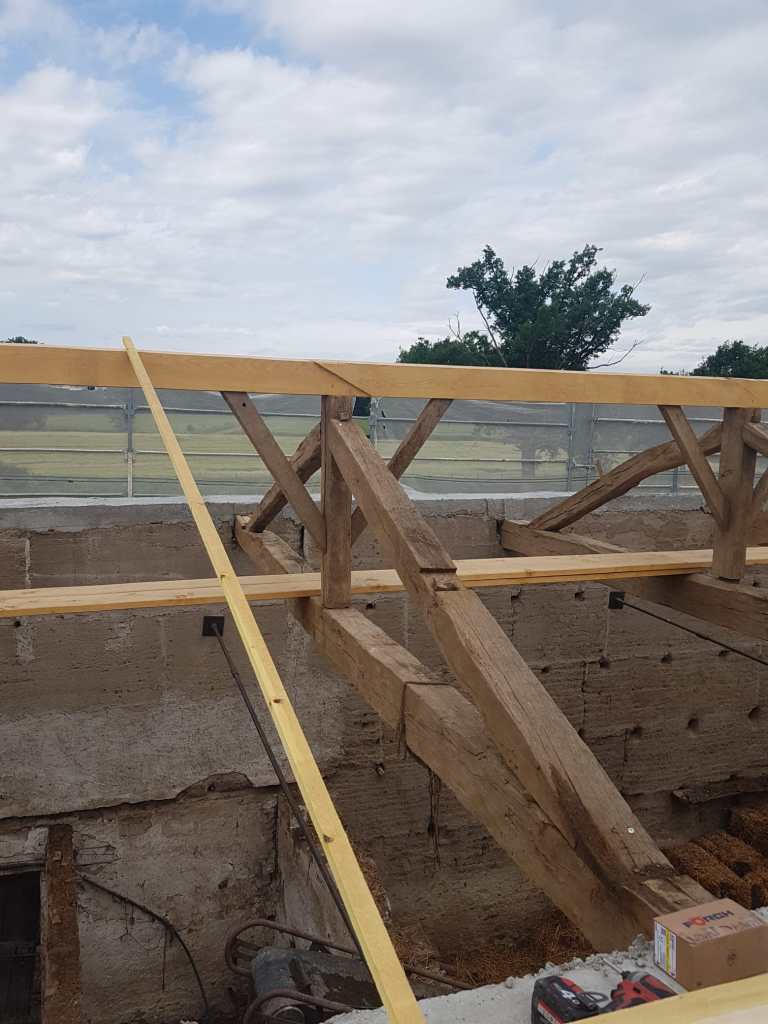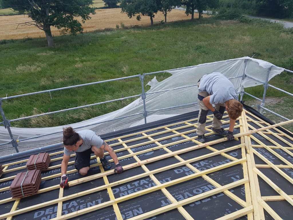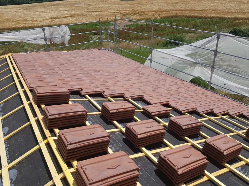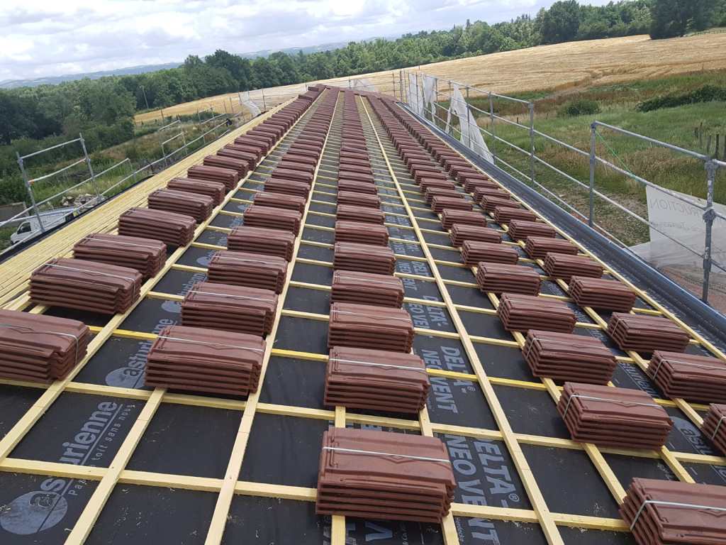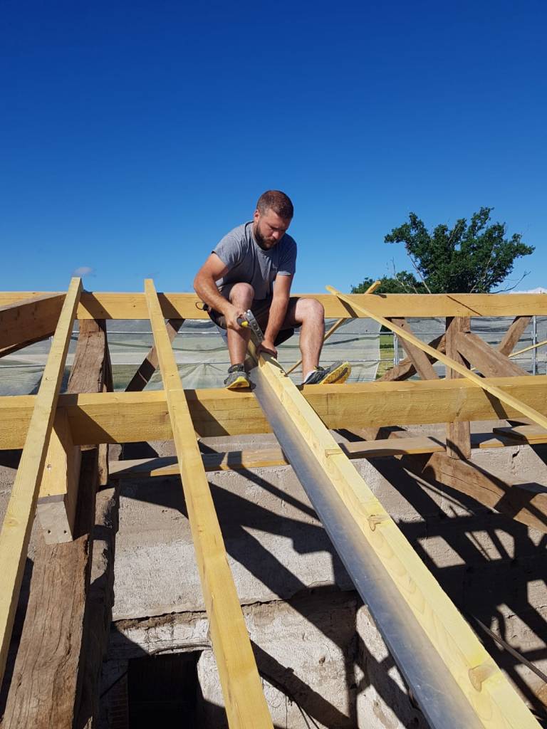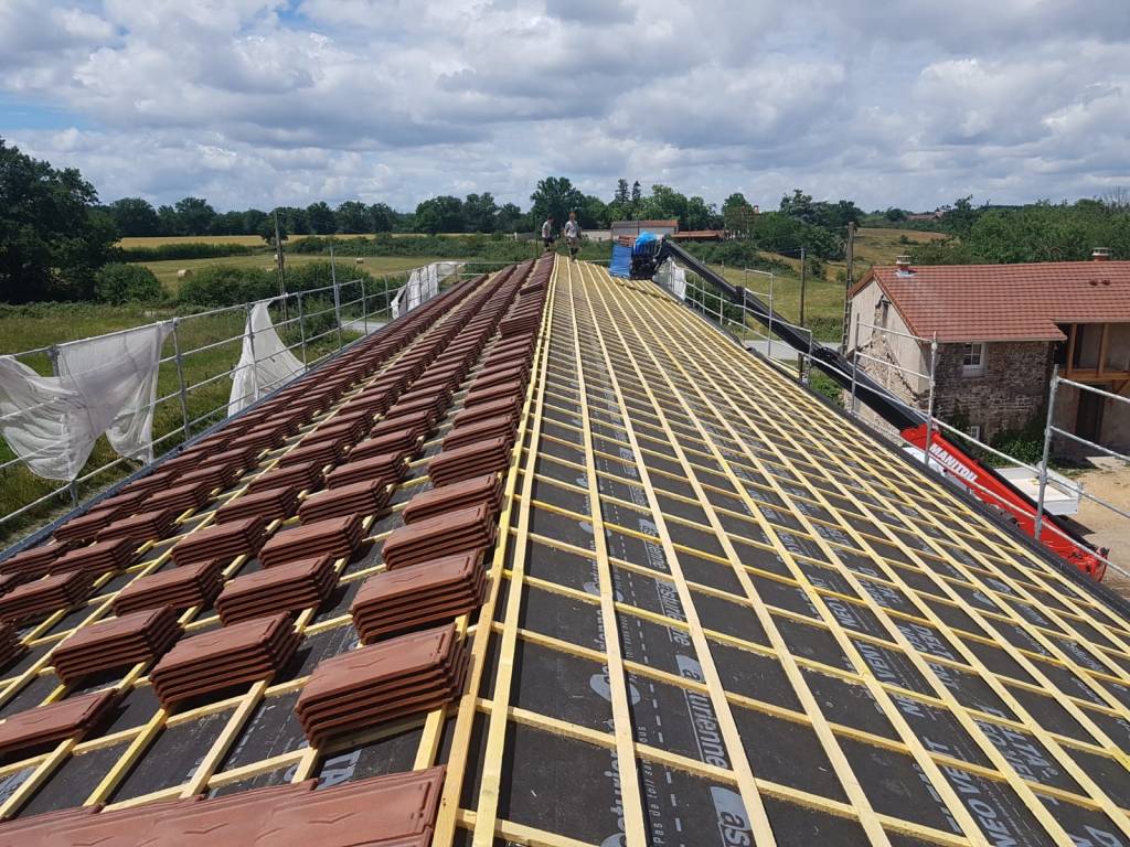 La préparation de cette toiture de 400m2 est en cours de reconstruction, pour accueillir la volige, le pare pluie et la tuile.