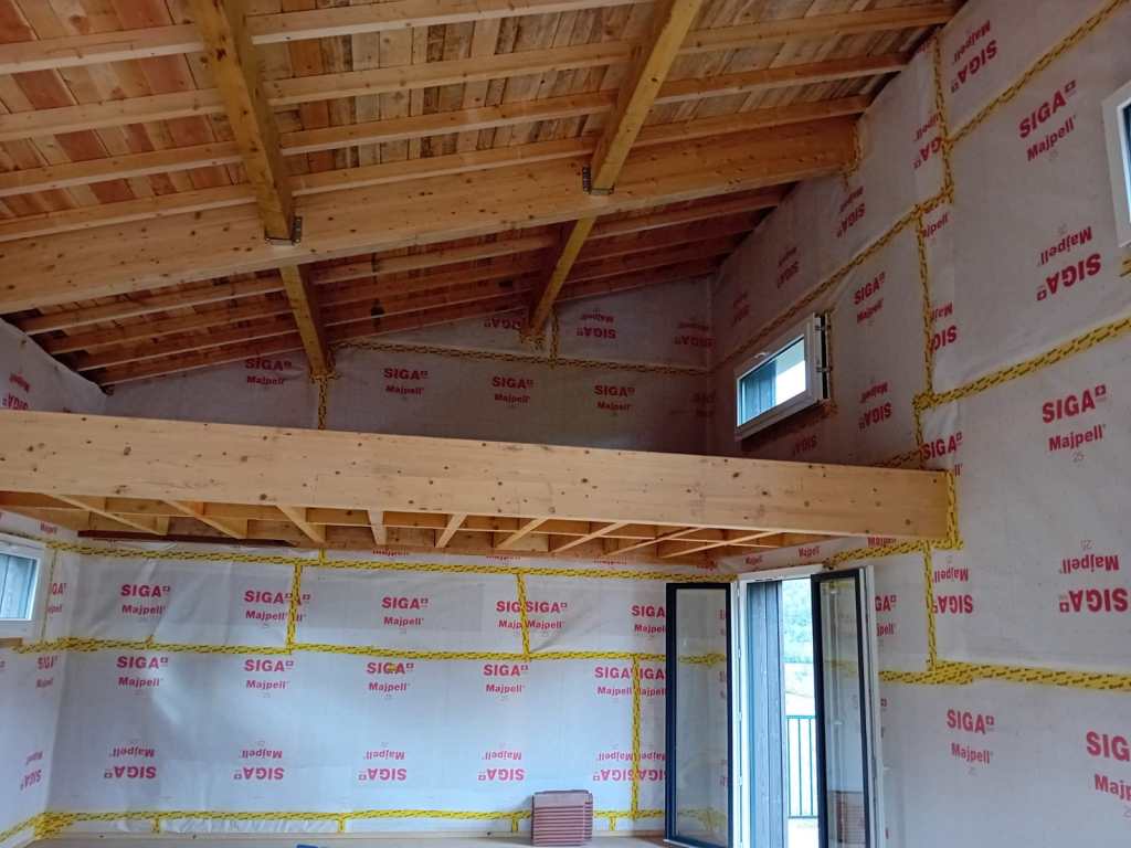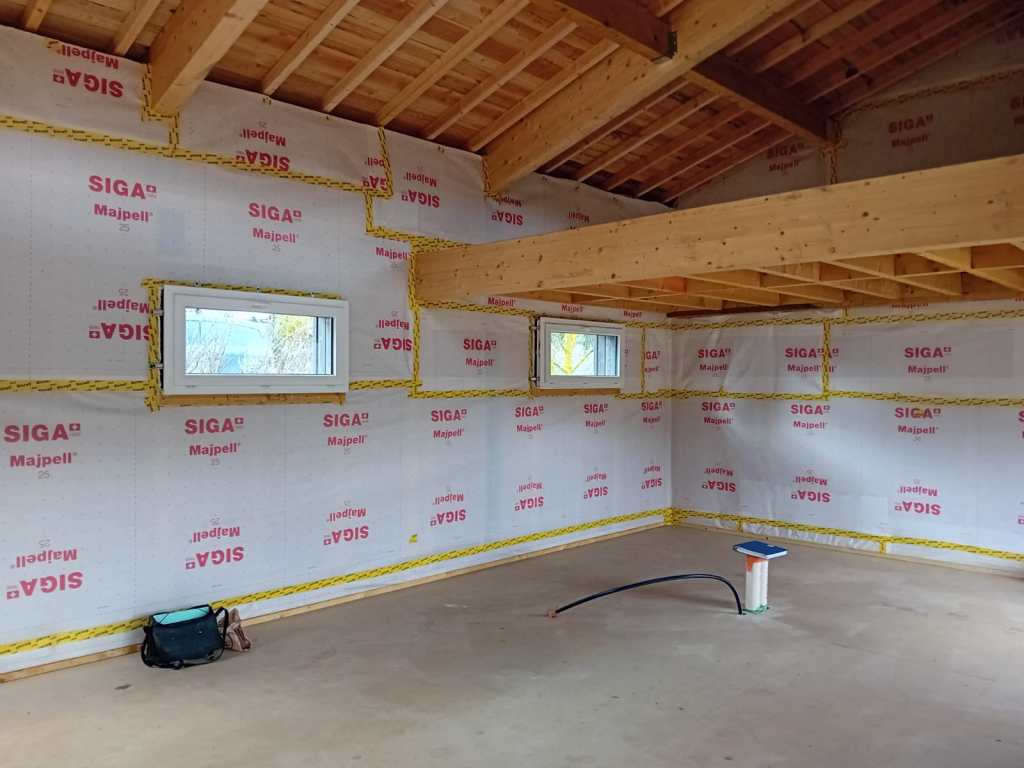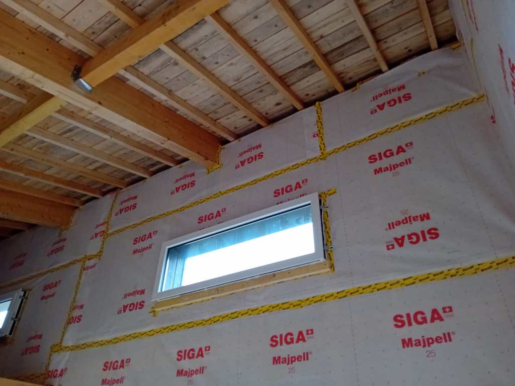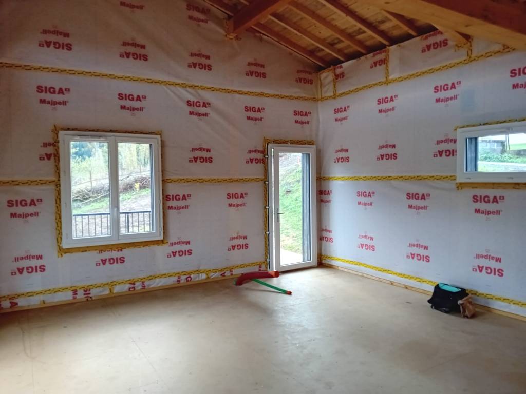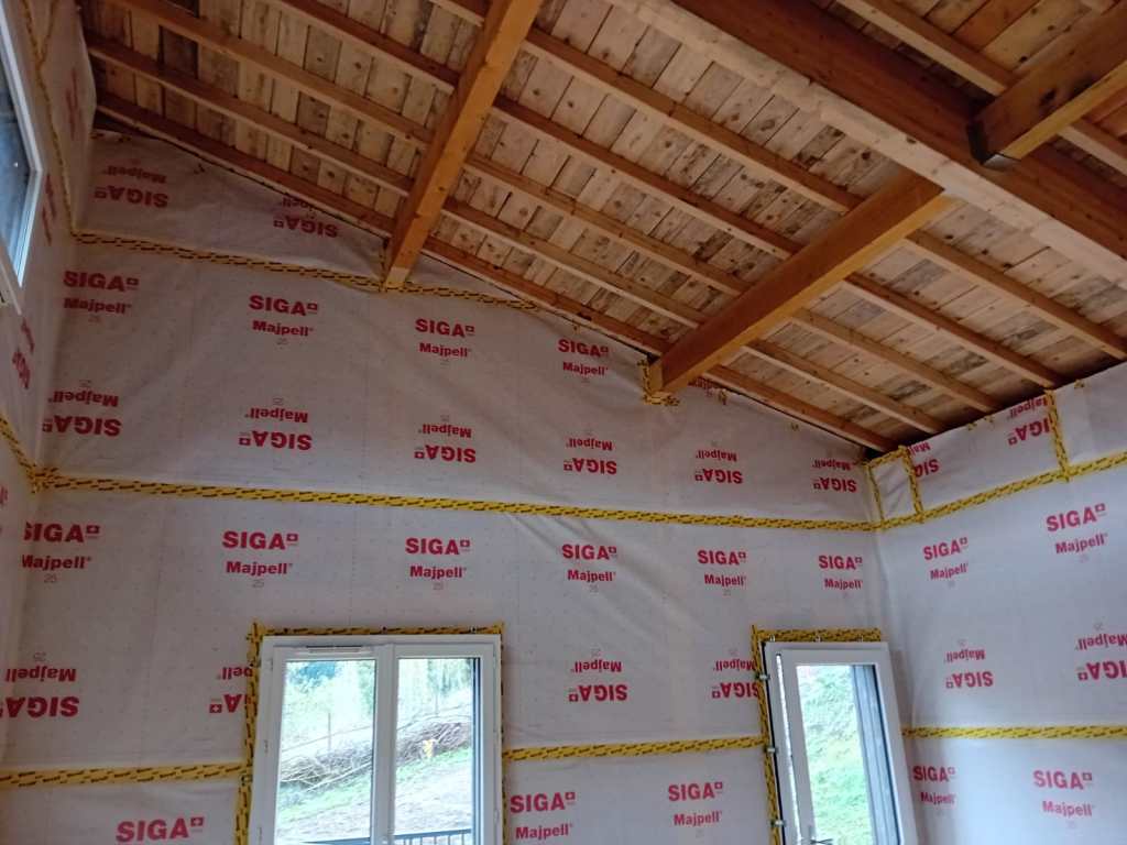 A découvrir à présent quelques photos des finitions intérieures réalisées par nos équipes. Mise en place d’isolation murale en laine de bois épaisseur 180mm et d’un pare vapeur étanche pour assurer une étanchéité parfaite.